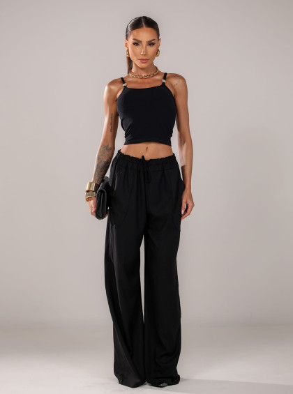 O cropped preto é uma peça versátil e sofisticada, ideal para composições modernas e estilosas. Com modelagem ajustada ao corpo, valoriza a silhueta com conforto e caimento impecável. As alças finas com detalhe metalizado dourado trazem um toque de elegância e elevam o design minimalista da peça.