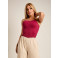 A modelagem ajustada valoriza a silhueta de forma natural, enquanto o tecido canelado traz um acabamento moderno e elegante. O destaque fica por conta das alças em corrente metálica, que elevam a peça e adicionam um toque fashion e sofisticado, perfeita para composições que vão do casual chic ao look noturno.